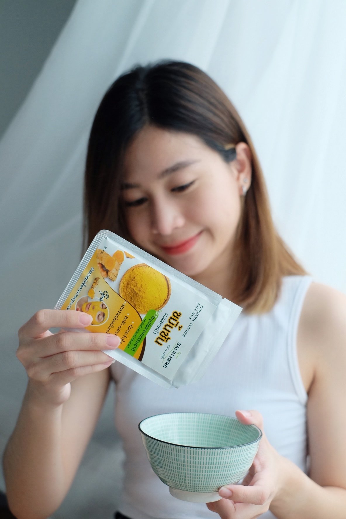 ผงสมุนไพร ขมิ้นชัน พอกผิวหน้า และผิวกาย คลิก