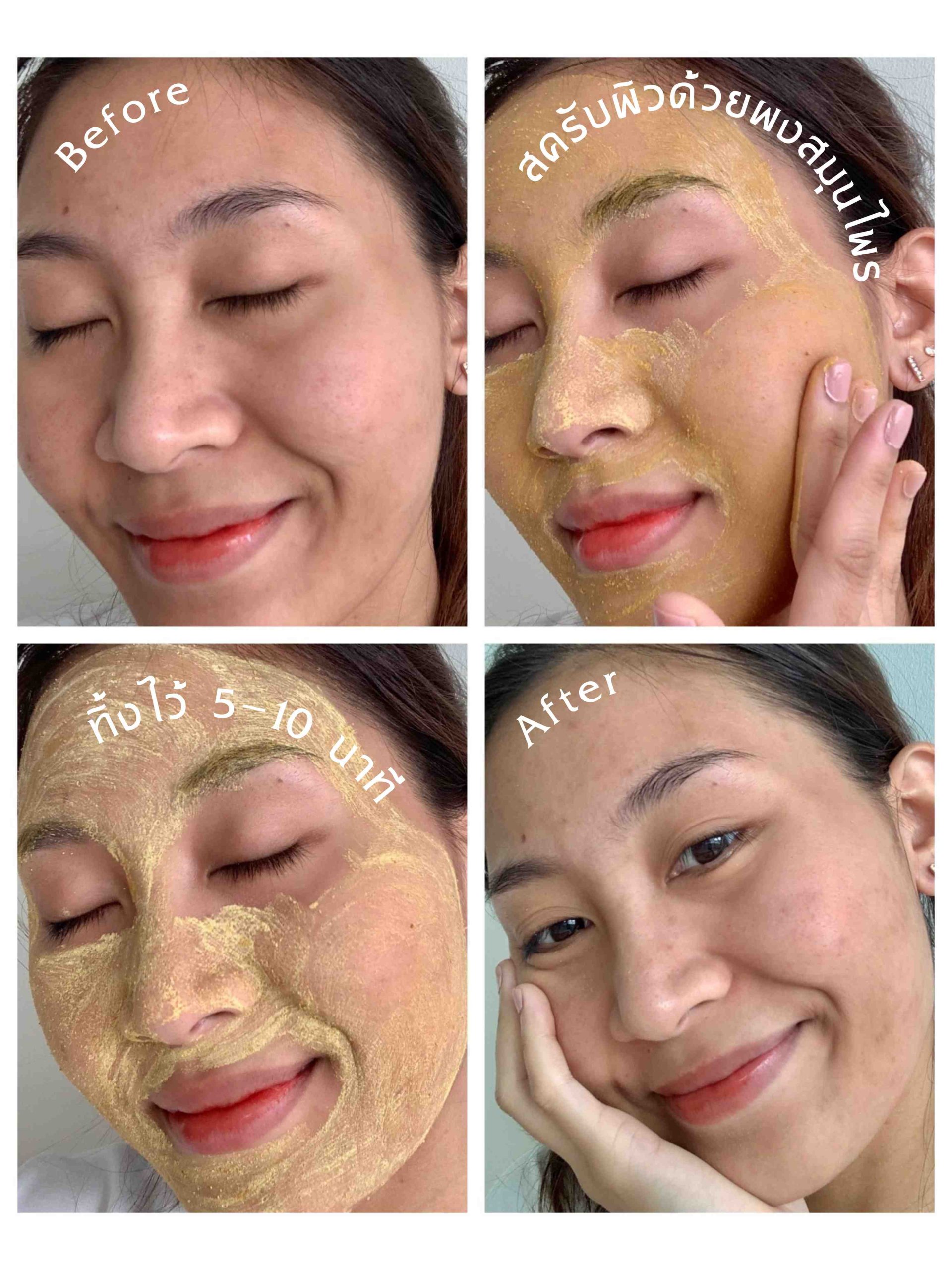 นำผงสมันไพรมาขัดบริเวณผิวหน้าได้เลย ขัดนวดวนเบาๆ ทั่วใบหน้า