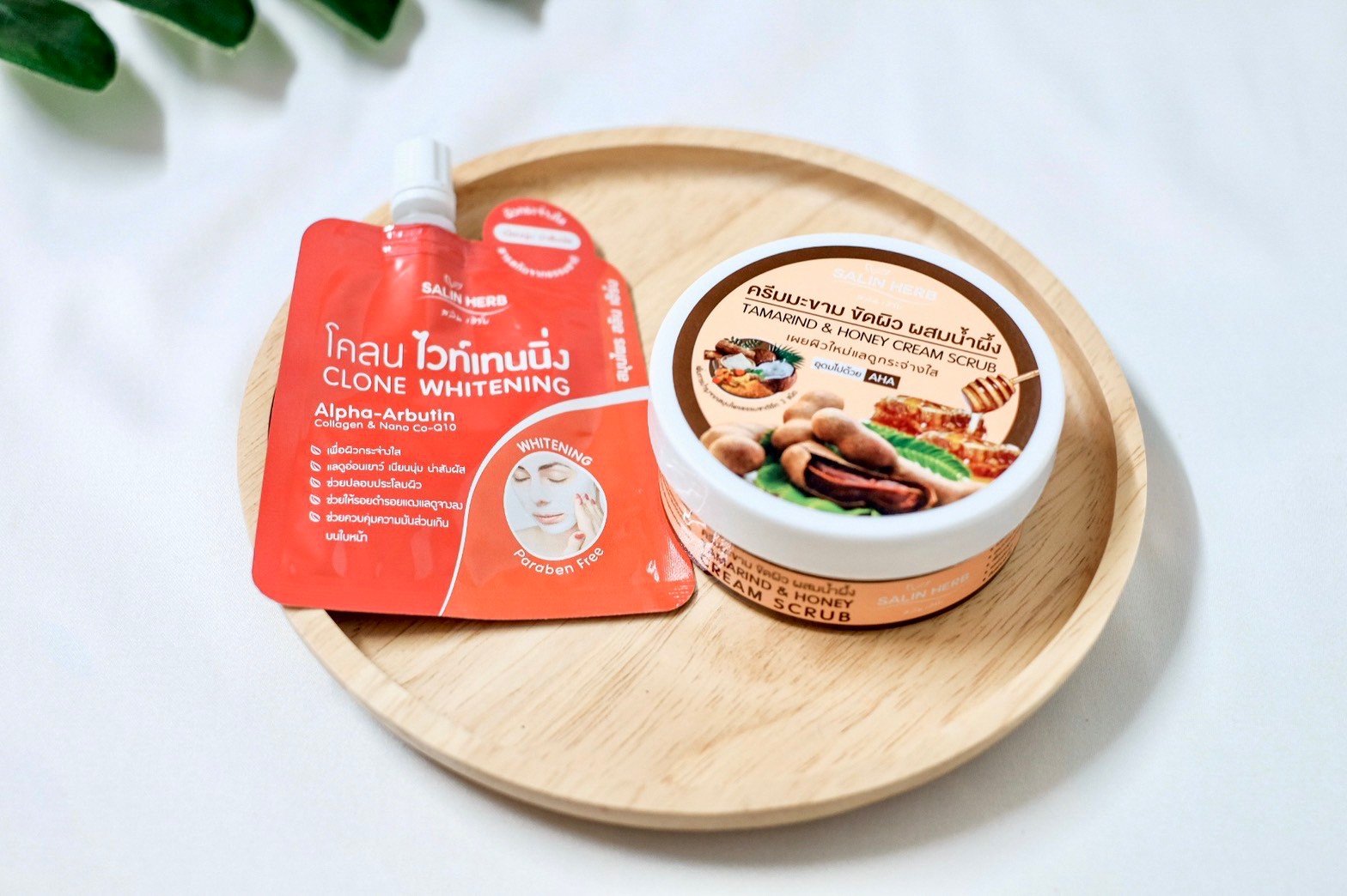 จนได้มีโอกาสลองใช้โคลนสมุนไพรไวท์เทนนิ่งและครีมมะขามขัดผิวผสมน้ำผึ้ง